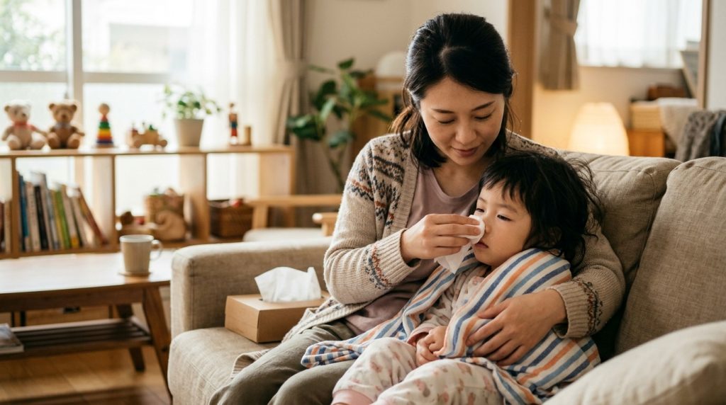 ※本記事は一般的な育児情報の提供を目的としており、医療アドバイスではありません。鼻水・鼻づまりが長引く場合や、発熱・耳の痛みを伴う場合は、かかりつけの小児科または耳鼻科にご相談ください。夜間・休日の急な症状は、子ども医療電話相談(#8000)もご活用ください。